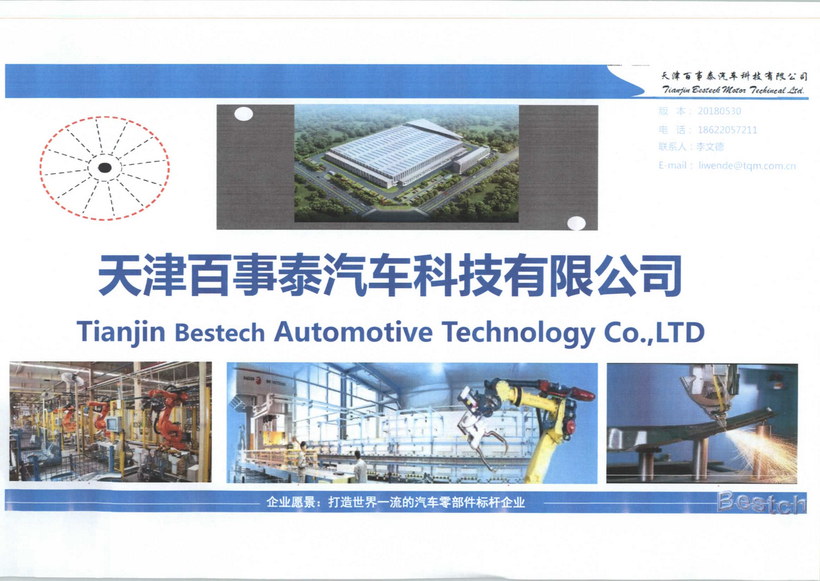 天津百事泰汽車科技有限公司,交通便利,位于天津空港經(jīng)濟(jì)區(qū),距離天津機(jī)場(chǎng)3公里,緊鄰京津塘高速,注冊(cè)資金5000萬元;占地面積5800平方米,一期總設(shè)備投資3500萬元,主營(yíng)業(yè)務(wù)為熱沖壓零件生產(chǎn)、產(chǎn)品研發(fā)。